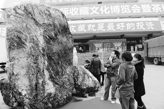 3月1日,參觀者在展場觀賞重達11.9噸的巨型“泰山玉王”。當日,2012太原國際收藏文化博覽會暨茶博會在中國煤炭博物館開幕,來自國內的參展商展出了珠寶玉石、奇石書畫、瓷器紫砂、紅木家具、茶葉等上百種收藏品。(來源:山西日報)