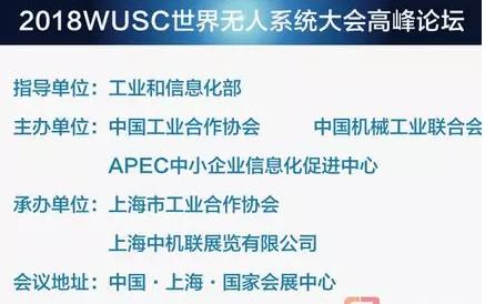 隨著新一年的到來,為了在人工智能新時代下加快推進無人系統創新應用,2018年7月4-7日由工信部指導,中國機械工業聯合會、中國工業合作協會、APEC中小企業信息化促進中心主辦,由上海市工業合作協會、上海中機聯展覽有限公司、世界無人系統展示交易中心承辦的“2018 WUSC世界無人系統大會”即將在國家會展中心(上海)隆重舉行,大會由無人系統展覽會和無人系統大會高峰論壇(7月5-6日)組成。以“創新、協同、融合、共享”的理念,以創新應用推進行業發展為落腳點,推動無人系統在物流、農業、測繪、電力巡線、安全巡測、應急救援、漁政城管交通執法等行業領域的創新應用。