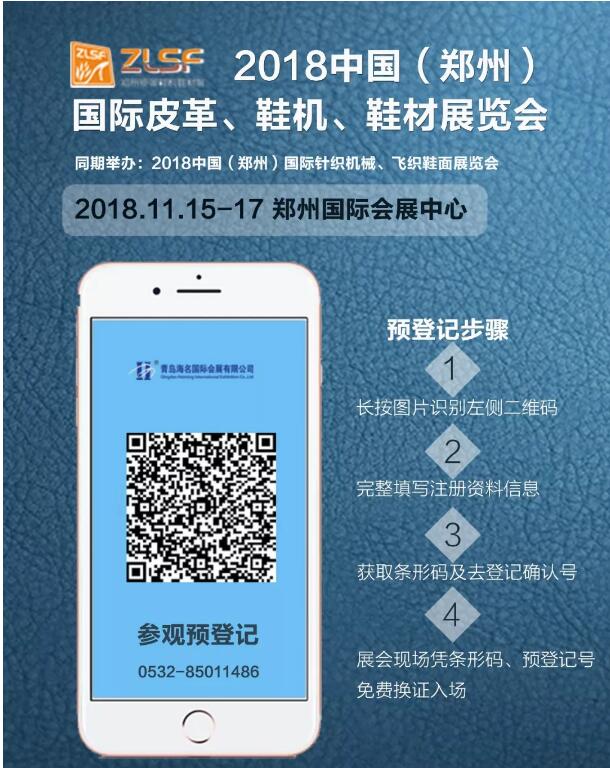 2018鄭州國際皮革、鞋機、鞋材展暨國際針織機械、飛織鞋面展(2018鄭州鞋機鞋材暨針織機械展)將于2018年11月15-17日在鄭州國際會展中心(鄭東新區)舉行,展會觀眾在線預登記通道現已全面開通!有意向參觀展會的鞋革、箱包、服裝等產業鏈上下游人士,只需完成在線預登記,即可獲得提前郵寄資料、免費領取價值百元會刊、現場優先參與行業活動等福利!