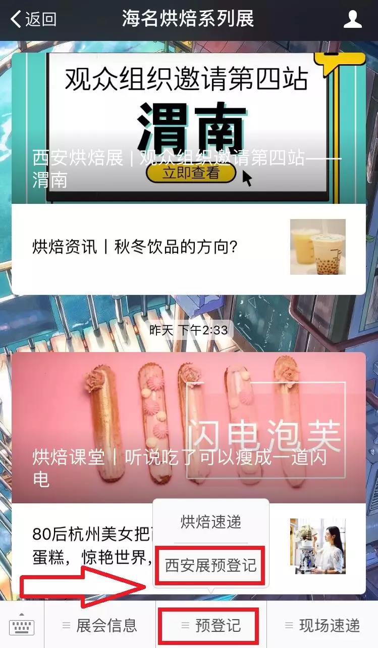 2、點擊微信菜單【預登記】的西安展預登記即可直接使用微信在線預登記服務