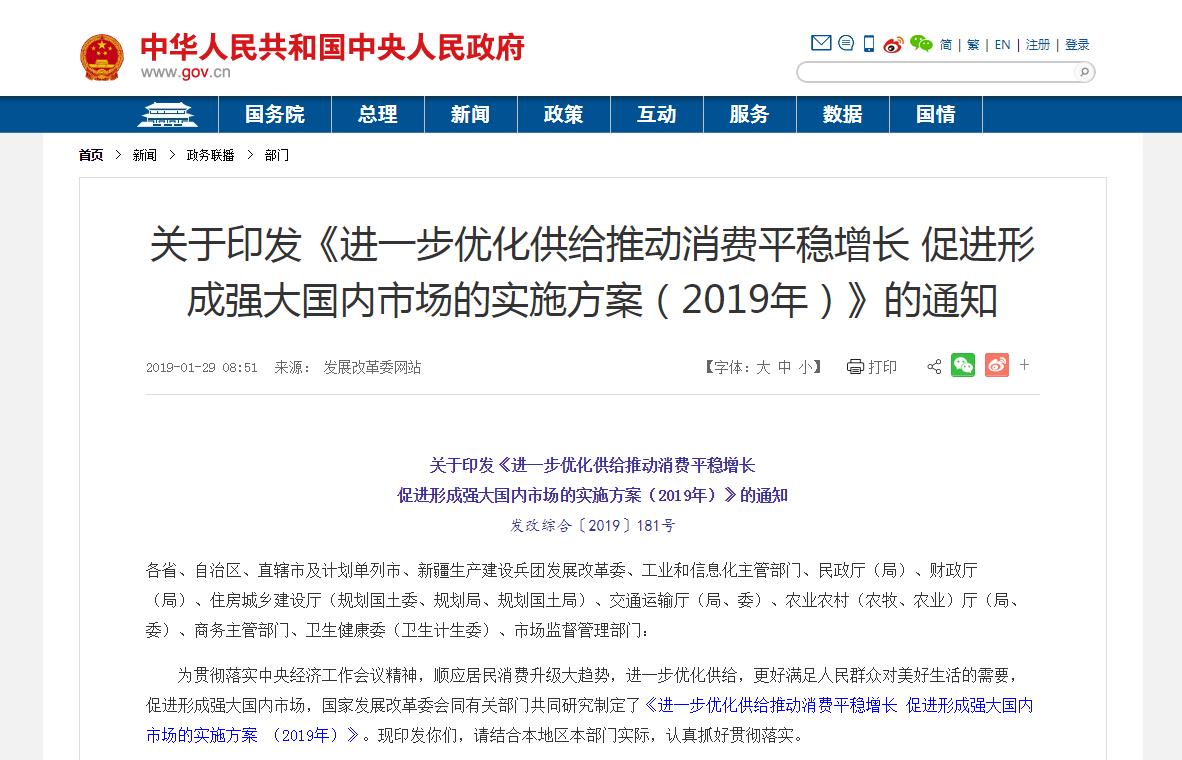 1月29日,國家發改委會同工業和信息化部、商務部等十部委聯合印發了《進一步優化供給推動消費平穩增長促進形成強大國內市場的實施方案(2019年)》中,制定六大措施促進汽車消費,涉及老舊汽車報廢更新、新能源補貼、農村汽車更新換代等方面。