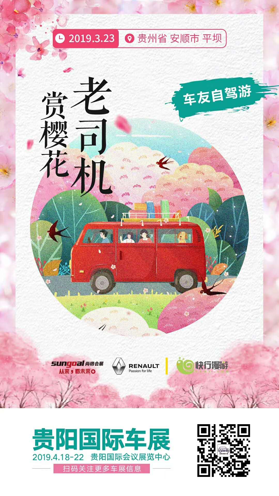 為增強4月18-22日在貴陽國際會議展覽中心舉辦的貴陽國際車展的傳播力、提升品牌影響力和市民關注度、促進市民與經銷商的互動交流,為參與貴陽國際車展的合作伙伴創造價值,3月23日,貴陽尚格聯手孟關東風雷諾十和田風景店、貴州快行漫游網共同開展了“2019貴陽國際車展.老司機賞櫻花.車友自駕游活動”。