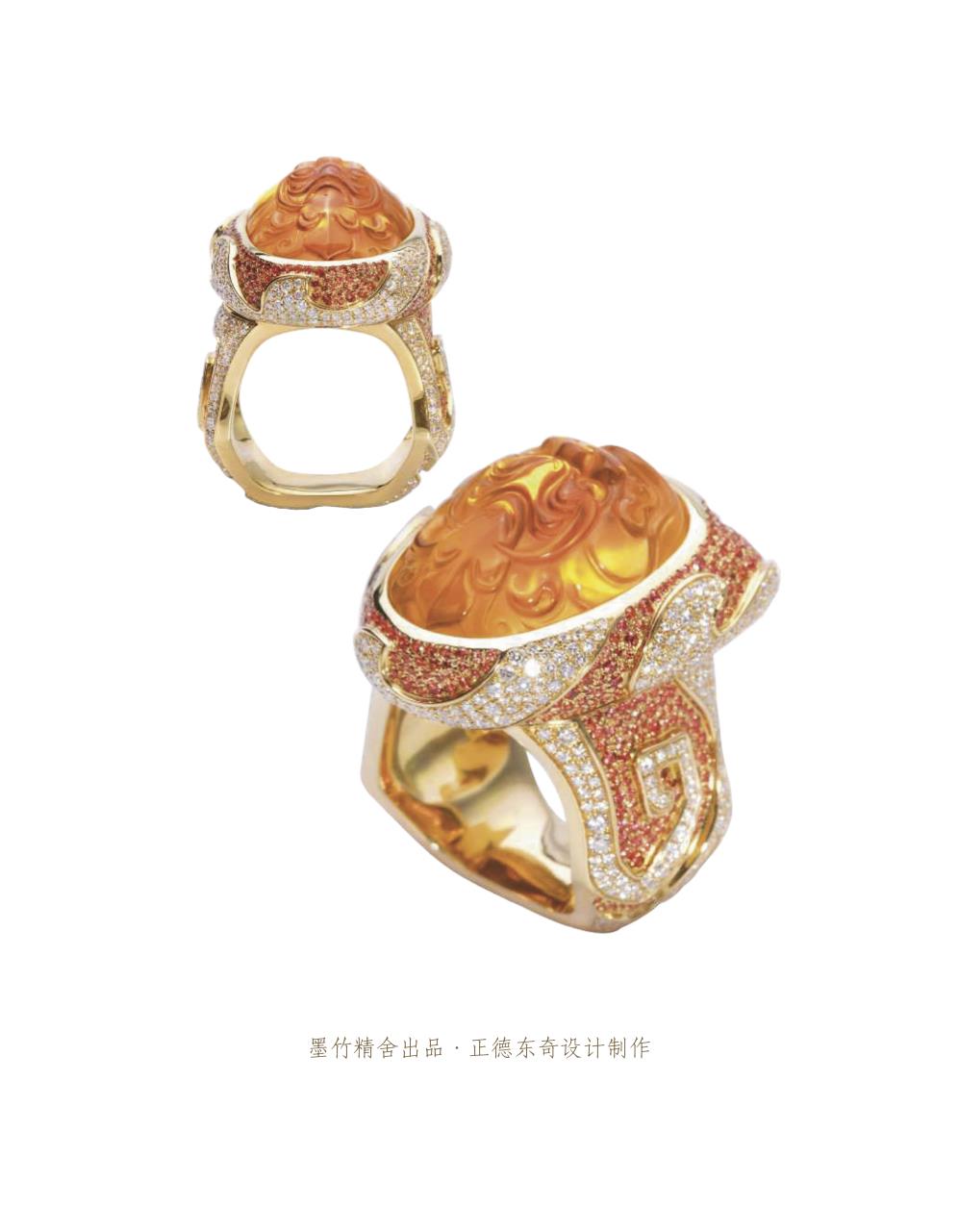 設計師以粗獷有力的金屬線條和明亮溫暖的配石色彩,恰到好處的迎合了大師雕刻作品。整件作品完美演繹出雕刻作品與金工鑲嵌的和諧融洽。配以繁復華麗的鑲嵌工藝。獲得第十屆中國上海玉石雕刻“玉龍獎”銀獎。