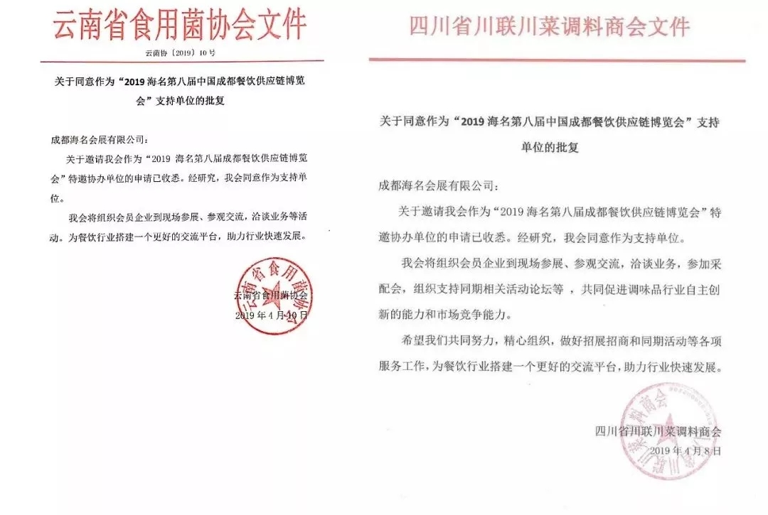 【朱臺鎮(zhèn)行業(yè)商會、全國工商聯(lián)廚具商會西部工作站、成都市水產(chǎn)行業(yè)協(xié)會、云南省食用菌協(xié)會、四川省川聯(lián)川菜調(diào)料商會 復(fù)函】