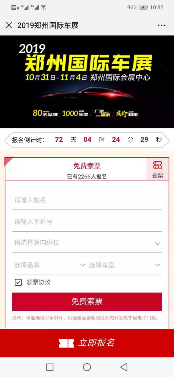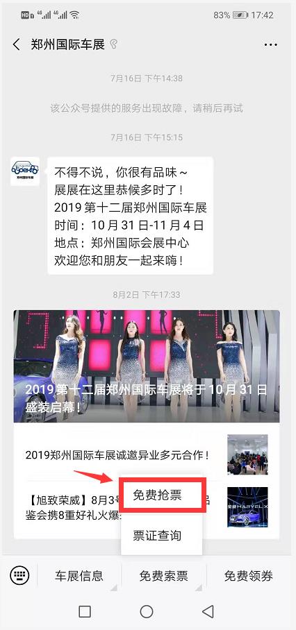 1、關(guān)注“鄭州國(guó)際車(chē)展”官方微信,選擇菜單欄“免費(fèi)索票”,點(diǎn)擊“免費(fèi)搶票”;