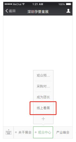 一.關注公眾號【深圳孕嬰童展】,點擊菜單-觀眾中心-線上看展