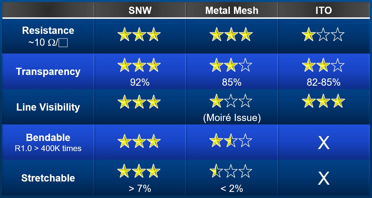 江博士表示,之所以選擇納米銀線,也是多方考慮后選擇的結果。因為納米銀線相對于其他柔性觸控材料、如金屬網格、石墨烯等材料,其性能的優越性更為全面。