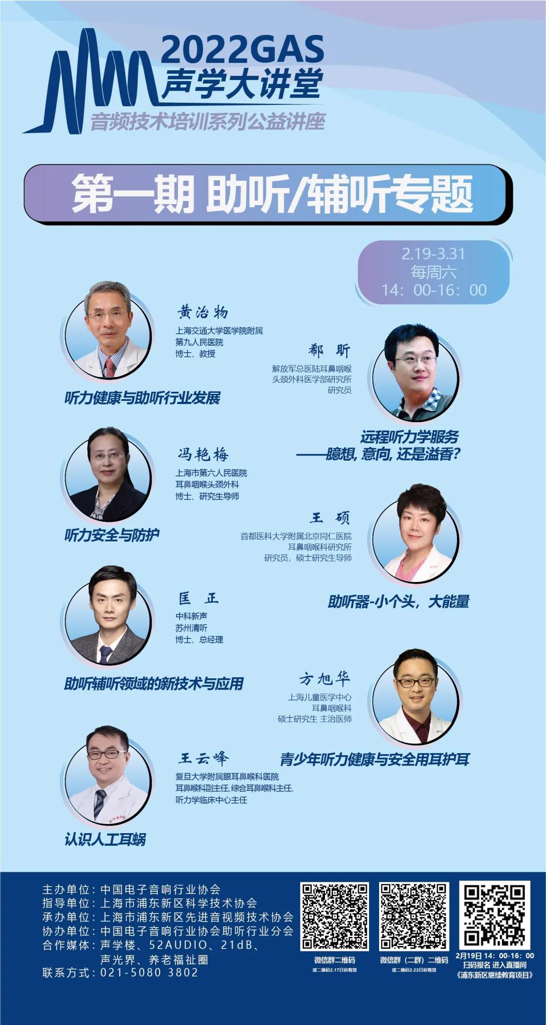 2022年2月19日下午2點,協會將正式舉辦《2022GAS聲學大講堂—音頻技術培訓系列公益講座》啟動大會,來自上海交通大學醫學院附屬第九人民醫院的黃治物教授為大家分享《聽力健康與助聽行業發展》。