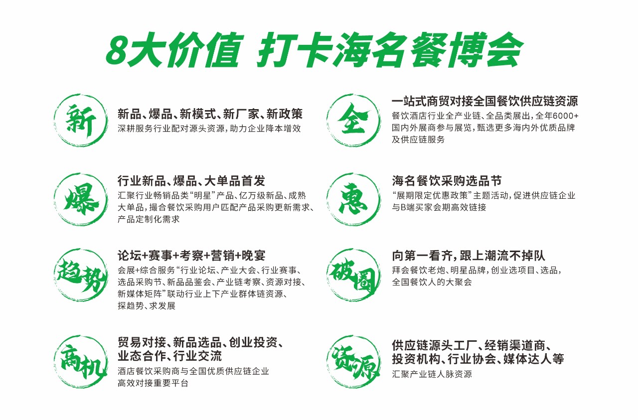 10年磨一劍,海名餐飲供應(yīng)鏈系列展無論在展會規(guī)模、影響力以及展會效果等方面,均取得行業(yè)的認同;創(chuàng)新價值模式,打造餐飲供應(yīng)鏈“會展+產(chǎn)業(yè)”綜合服務(wù)平臺。其中海名成都餐博會作為中西部區(qū)域全產(chǎn)業(yè)鏈、全品類、全渠道的行業(yè)盛會,始終引領(lǐng)著餐飲行業(yè)發(fā)展;不僅面向全國用戶展示餐飲供應(yīng)鏈領(lǐng)域的年度新品、爆品、先進技術(shù)、定制化解決方案等,更是促進行業(yè)發(fā)展,屬于餐飲酒店采購商與全國優(yōu)質(zhì)供應(yīng)鏈企業(yè)高效對接的重要平臺。